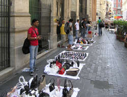 Many of the vendors clearly aren’t operating legally; I recall seeing one vendor, in Venice, having a worried conversation with a colleague who had just arrived upon the scene, and then quickly packing up his trinkets into a white sheet and running off, very fast; two minutes later, two members of the police force casually strolled into the area – I don’t know if they were even aware that an illegal vendor had been operating there or not. However, if these men are willing to risk arrest to sell their goods, there must be some pay-off and hence I must come to the conclusion that people are actually buying this rubbish.